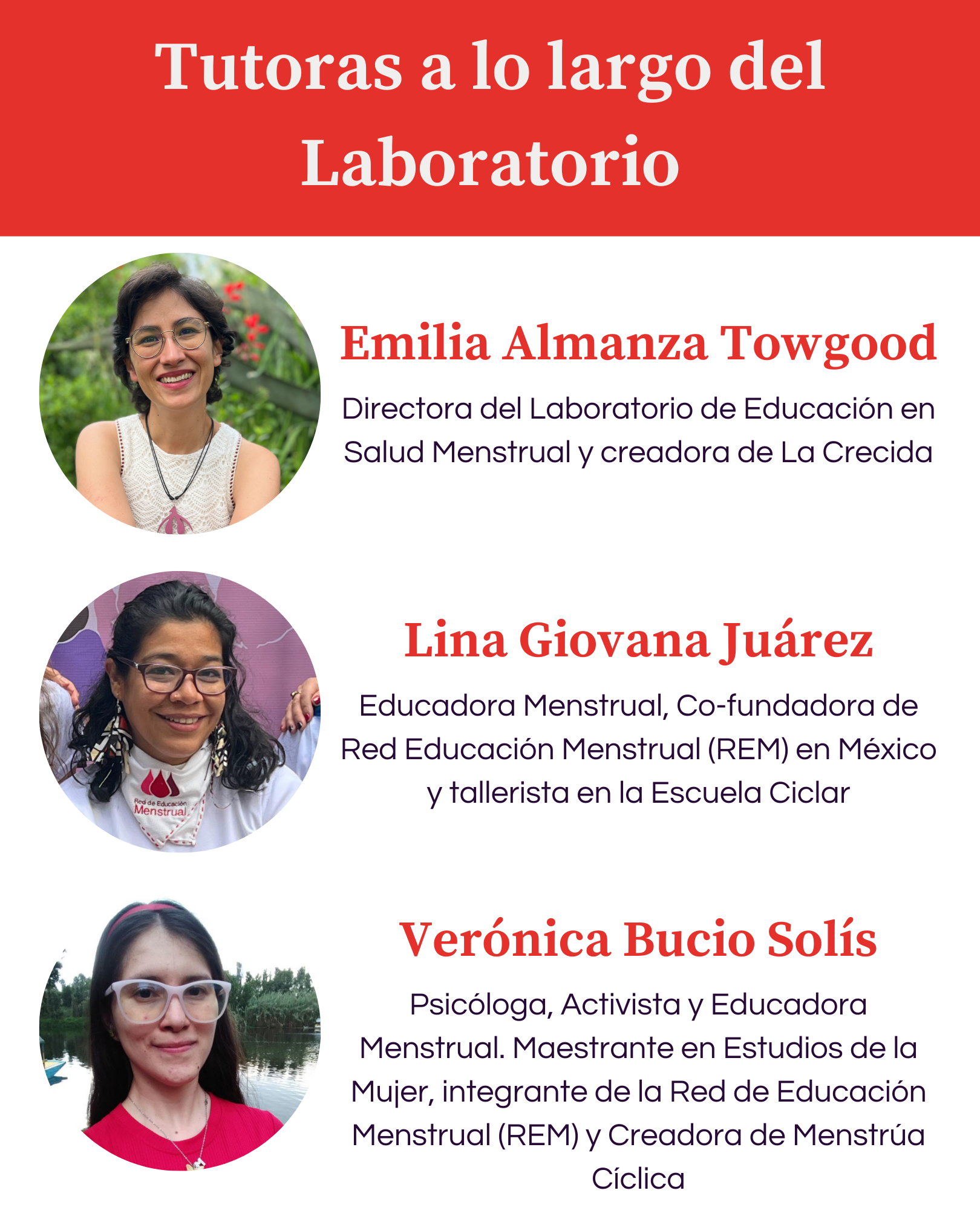 Estas docentes son mujeres comprometidas con la justicia menstrual y la construcción de un mundo donde la salud menstrual se viva con dignidad. Su experiencia es diversa, su mirada crítica y su práctica profundamente inspiradora.
